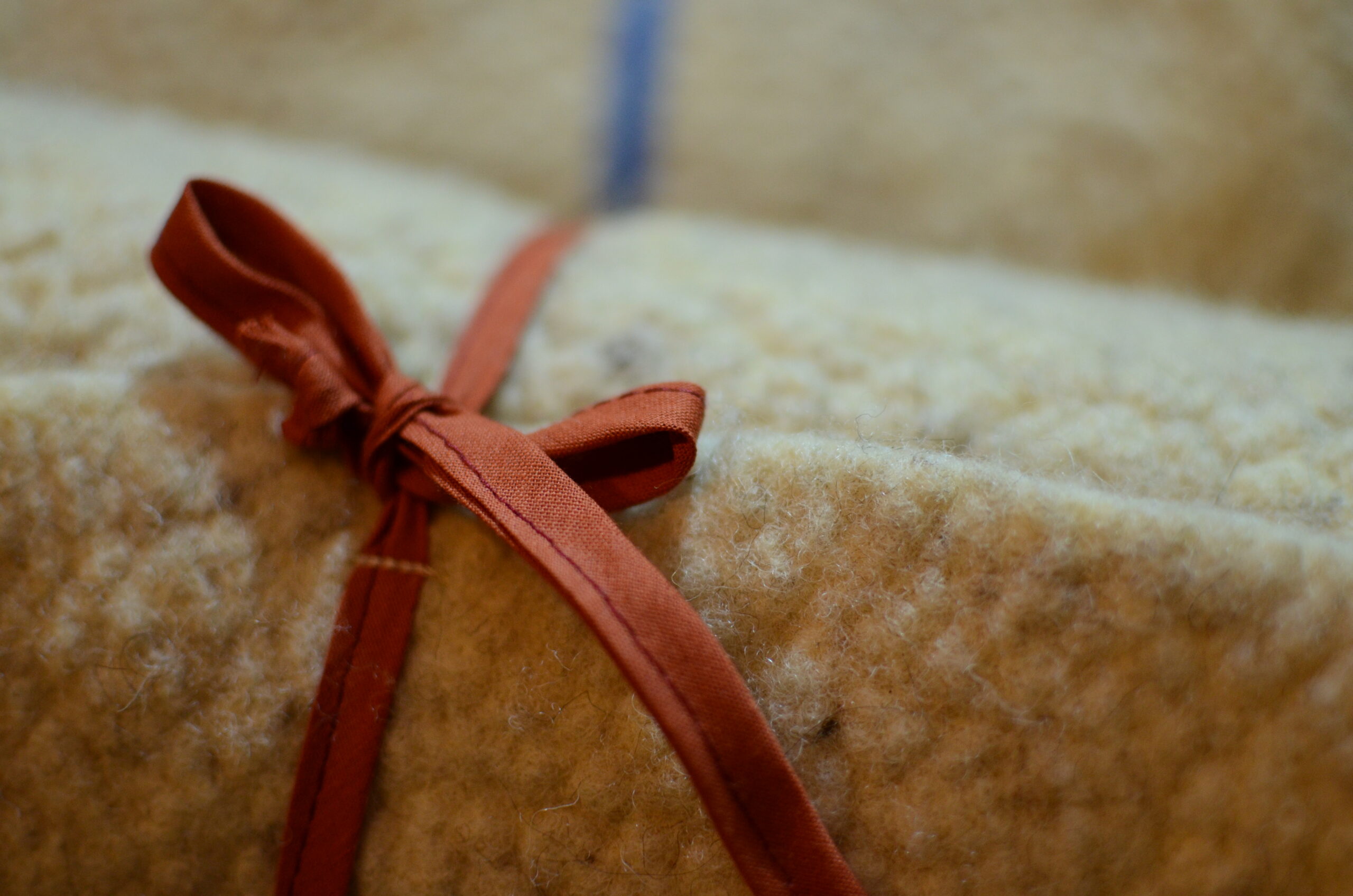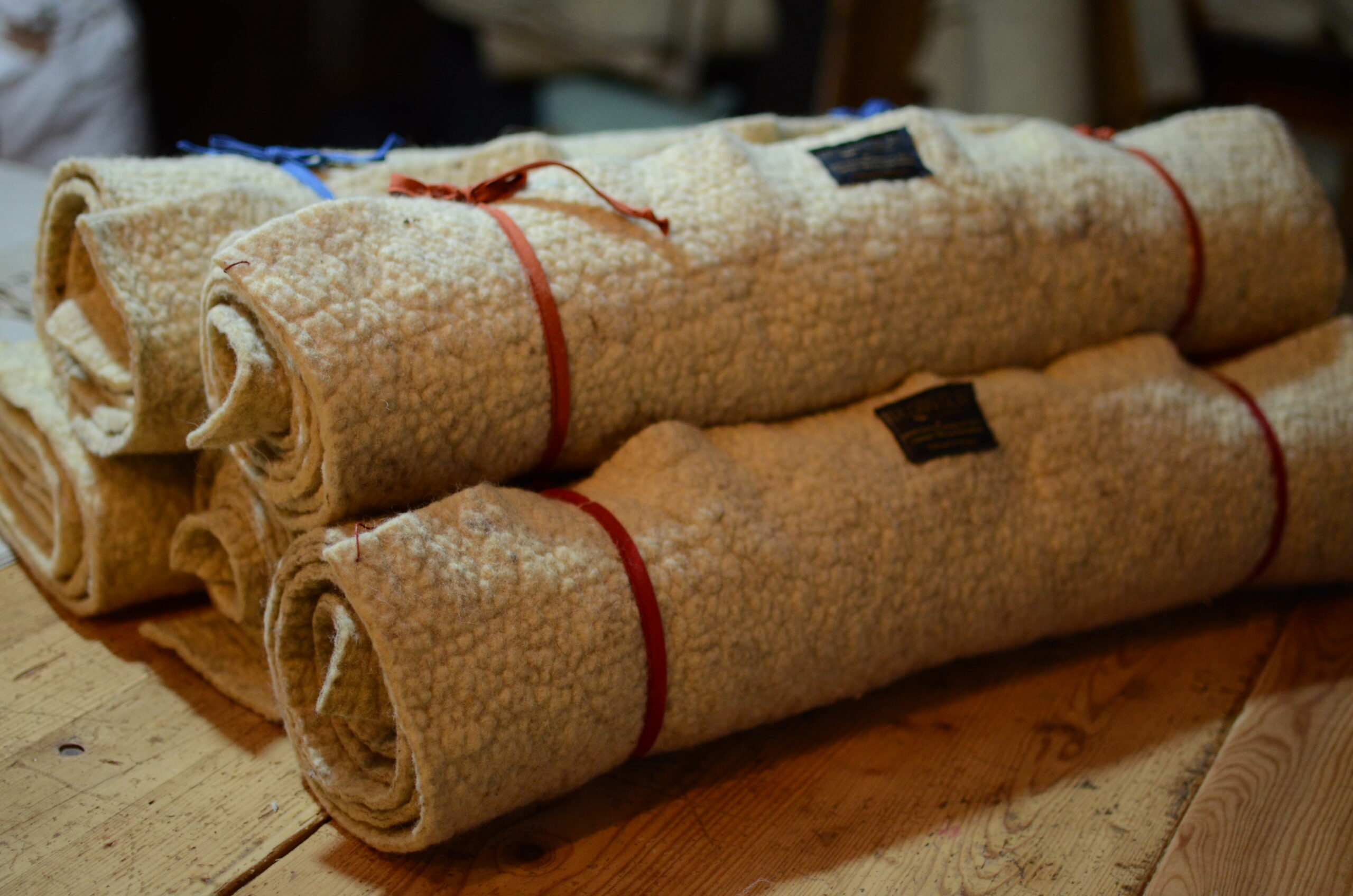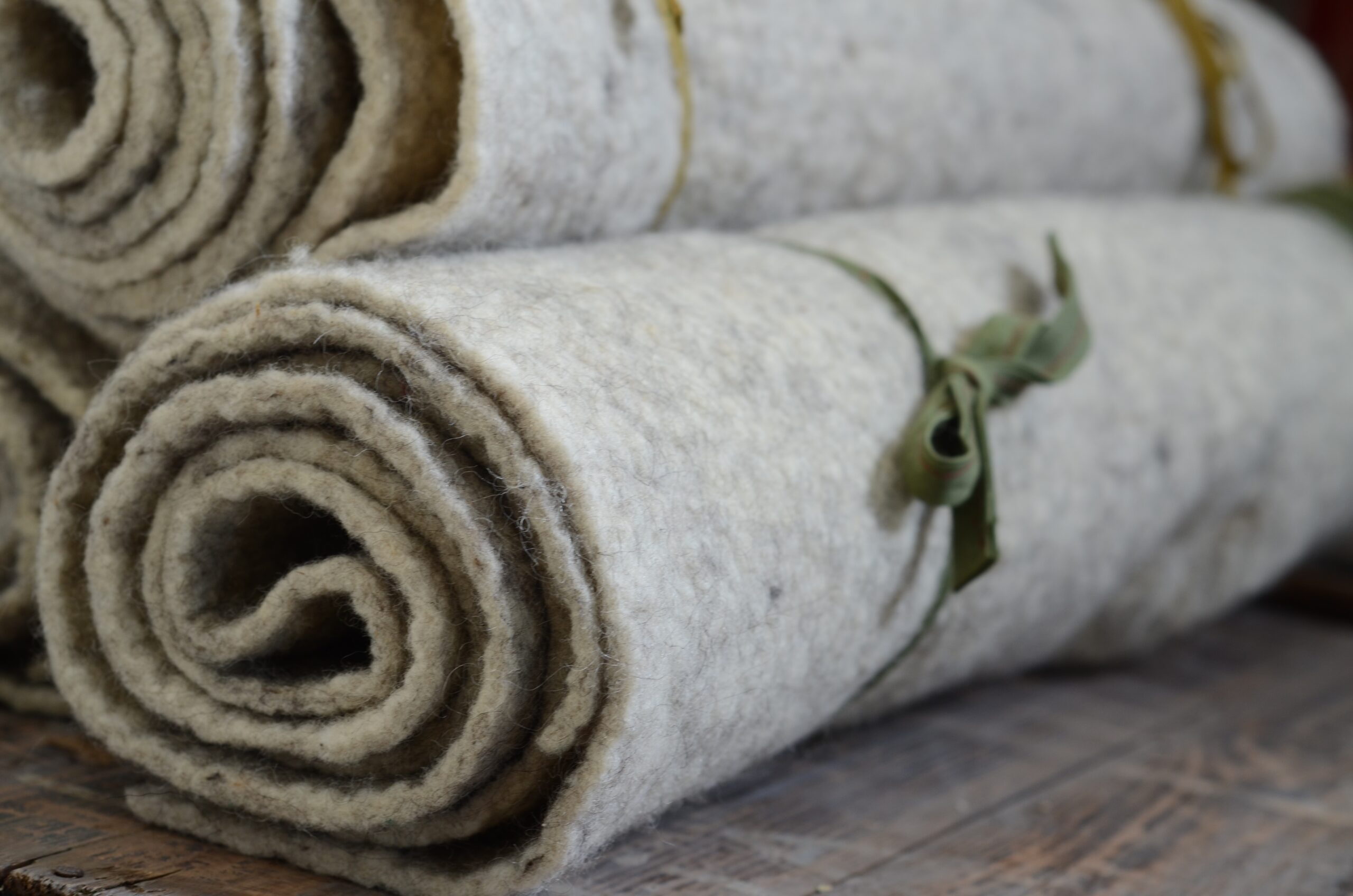 Quand la laine est collectée dans les fermes bretonnes puis triée, toute la laine n’a pas le ressort nécessaire pour faire de la literie ou la finesse pour du fil. Aussi pour ne pas perdre cette laine, elle est transformée en feutre. Après le lavage et le cardage de la laine, les nappes de laine obtenues sont frottées et roulées avec de l’eau de pluie et un savon doux. Ce procédé permet d’entremêler les fibres de laine et forme un feutre plus ou moins dense dans lequel on fabrique ensuite semelles, alèse, couvertures, tapis de yoga …